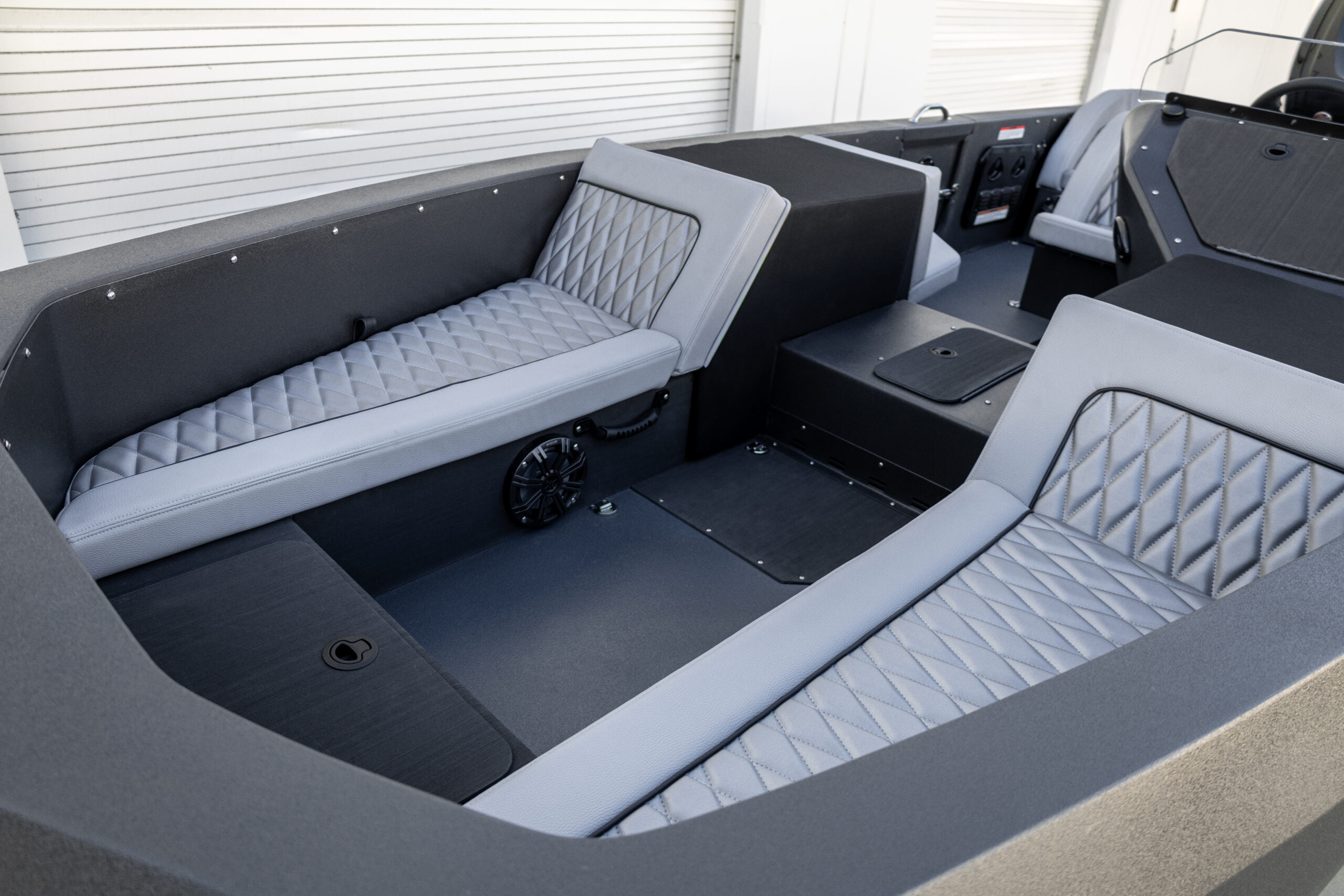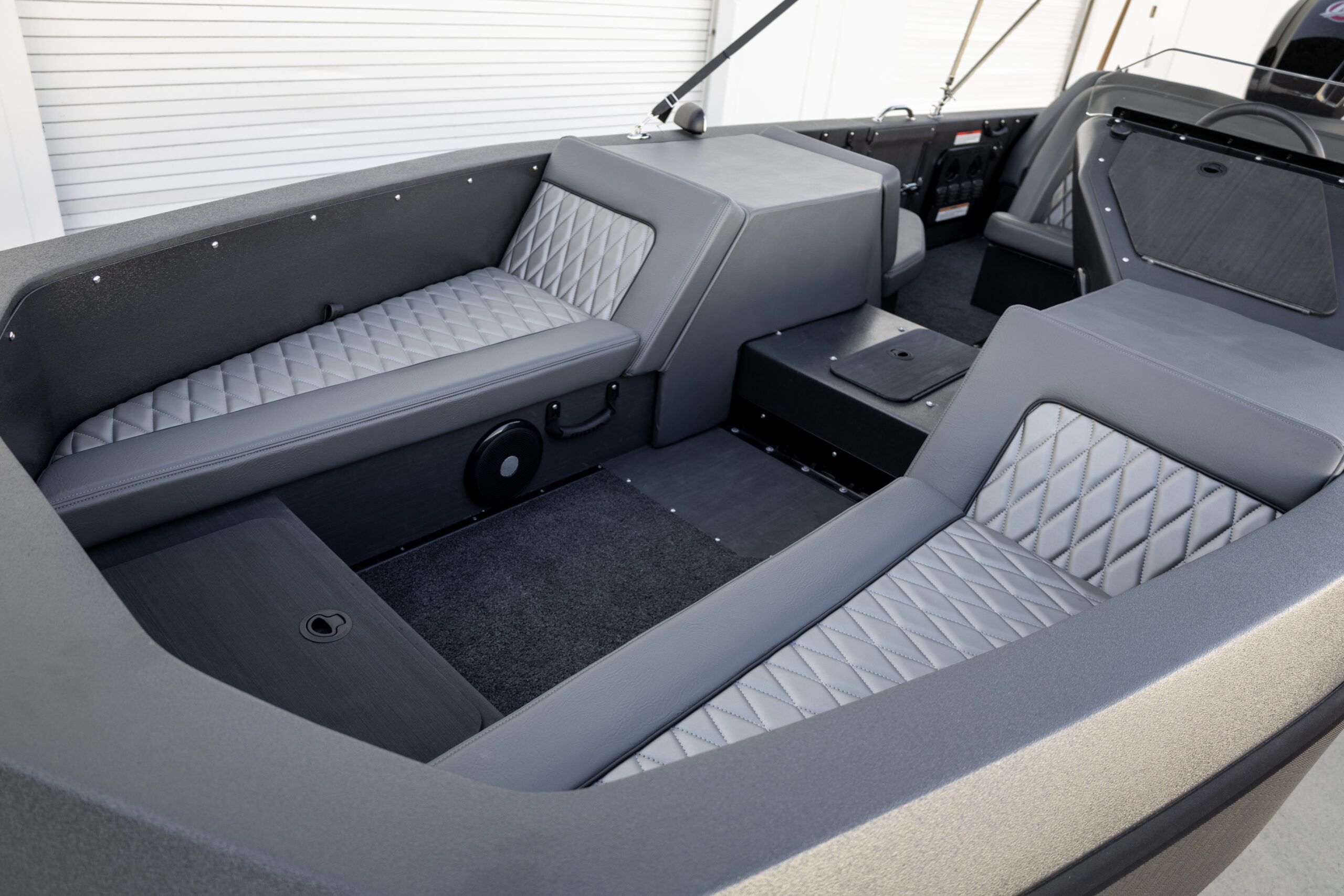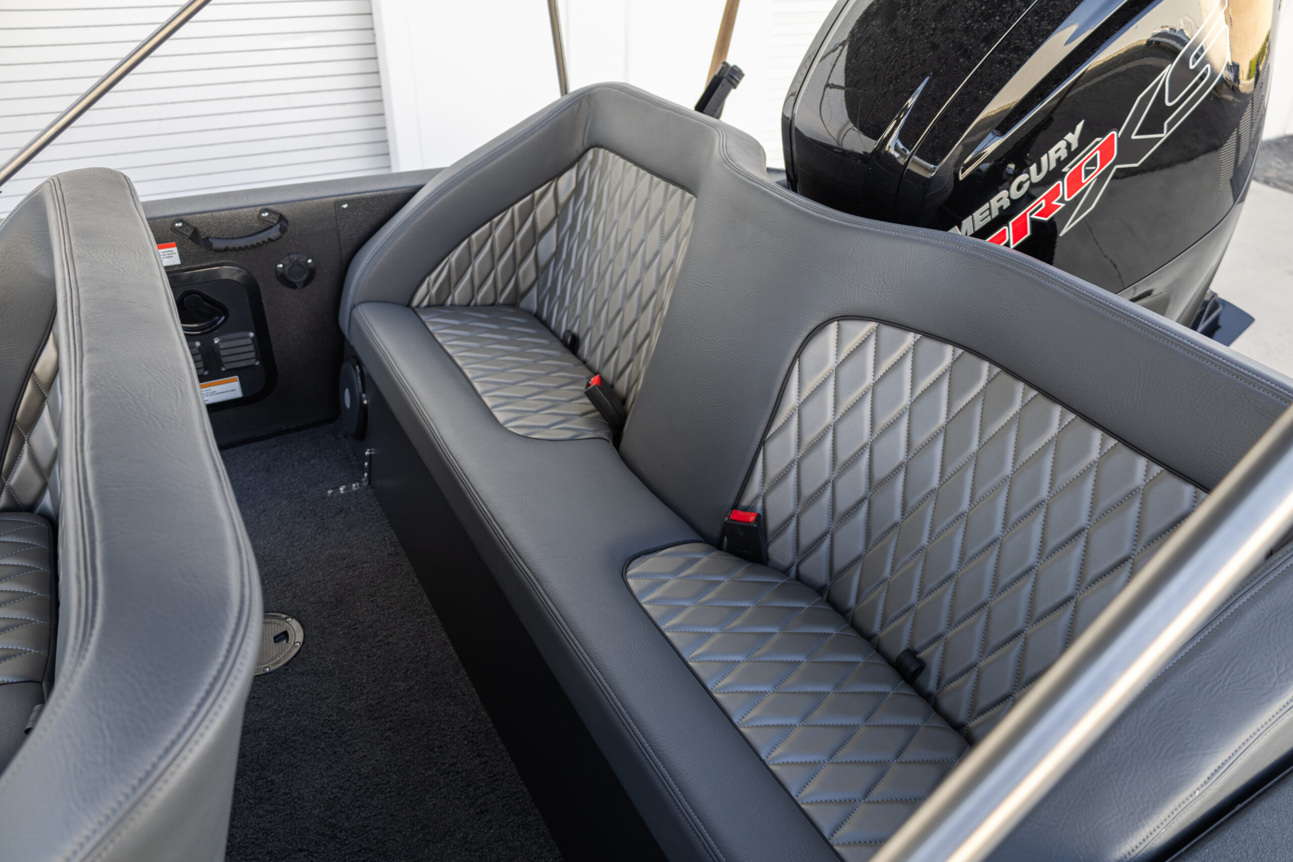 Matte black exterior with grey diamond-stitched interior