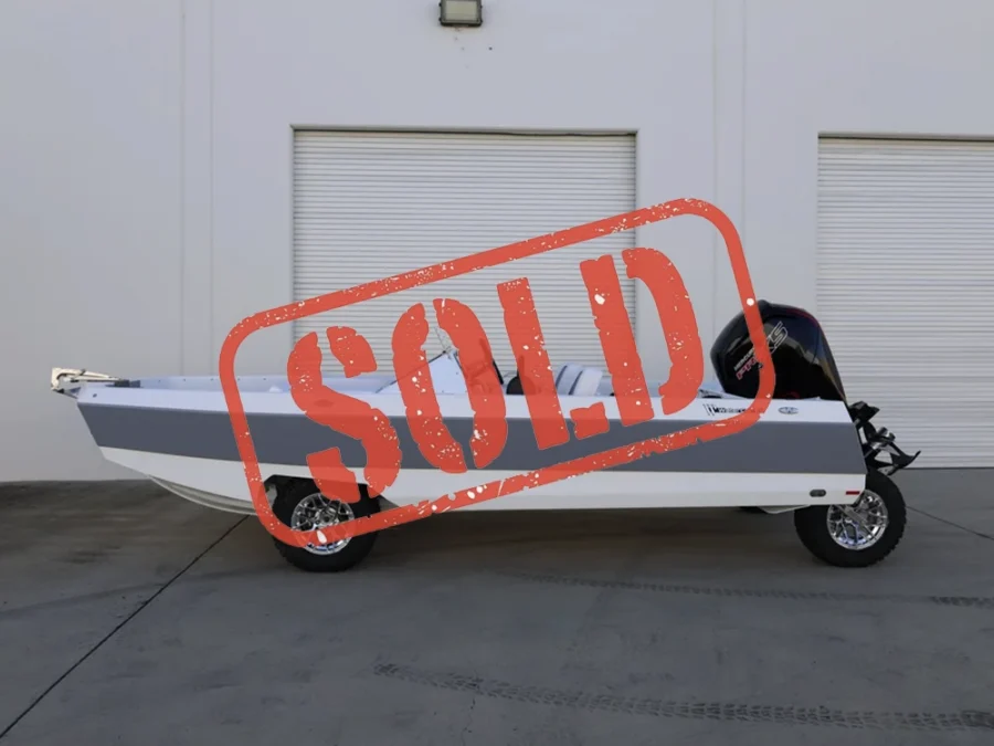 Finished in a clean white-and-grey exterior with premium diamond-stitched seating, this build presents a modern, versatile profile while maintaining the welded aluminum marine hull construction and integrated street-legal Low-Speed Vehicle platform that define WaterCar EV.