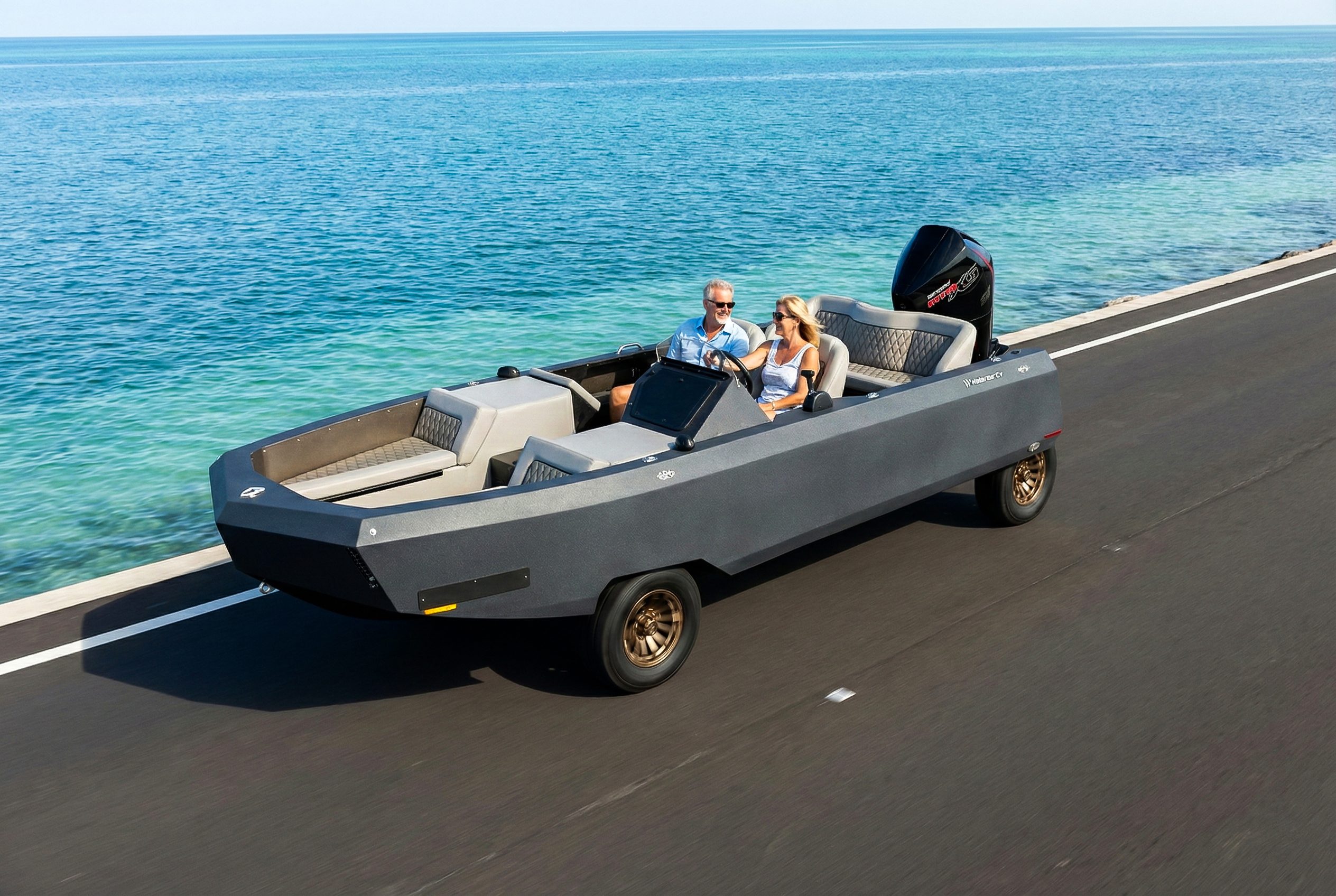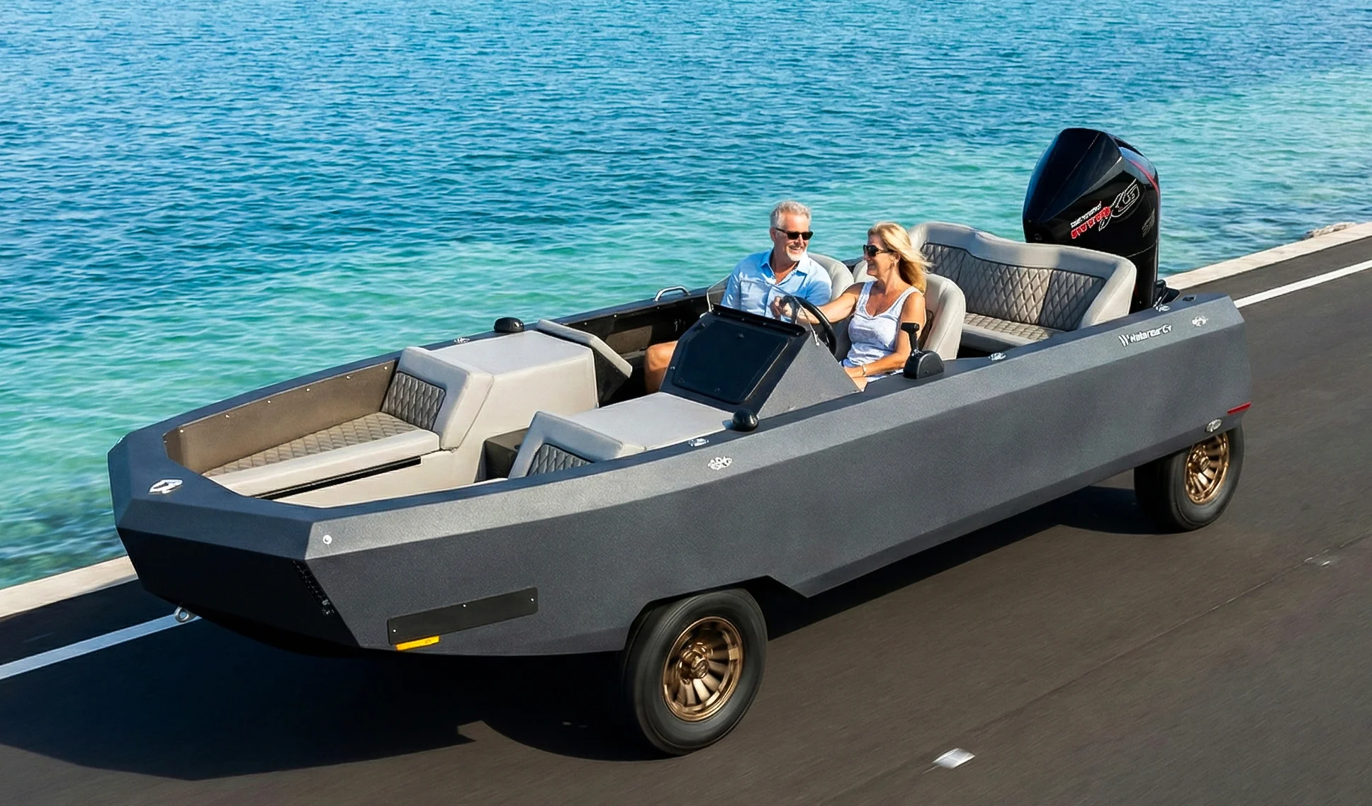 The WaterCar EV can be towed without a trailer. Connect it to a tow vehicle using the included hitch insert, press a button to raise the front wheels, and it rides smoothly on its own rear wheels in “tow mode.”